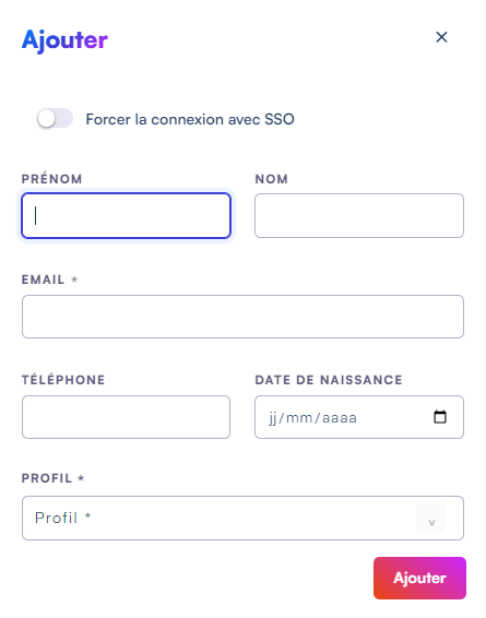 Maintenant, remplissez toutes les informations demandées, nom, prénom, email et ajouter un profil/rôle à votre nouveau collaborateur. (Sélectionnez lien vers guide lors de la prochaine étape pour comprendre les droits qui lui seront affectés).