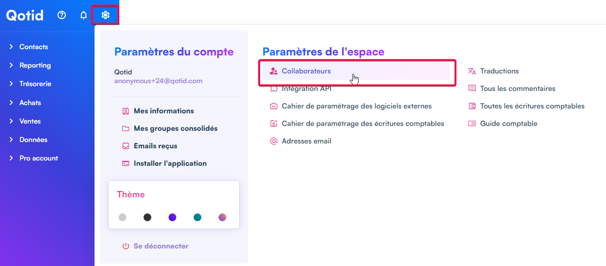 Cliquez sur "Paramètrage espace" puis sur "Collaborateurs".
