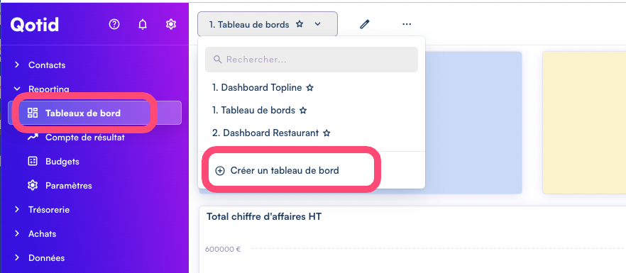 Si votre administrateur vous a donné les autorisations nécessaires, vous pouvez créer de nouveaux tableaux de bord sur Qotid. Ces rapports peuvent contenir plusieurs graphiques.