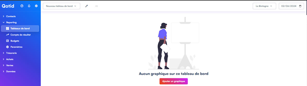 Une fois sur une vue de votre tableaux de bord, vous pouvez cliquer sur "Ajouter un graphique" pour éditer le premier graphique de votre vue