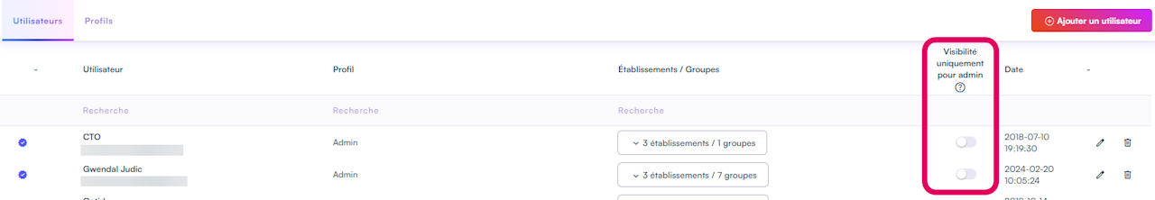 Ici, vous voyez la liste de vos collaborateurs. Pour les masquer, vous n'avez qu'à cocher les cases dans la colonne "Visibilité uniquement pour admin".