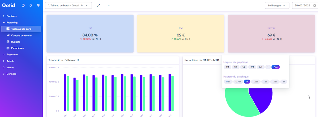 Cliquez sur "Paramètres" en haut à droite de votre graphique. Une fenêtre va s'ouvrir, à partir de celle-ci vous pouvez modifier la longueur ou la hauteur de votre graphique en sélectionnant la dimension qui vous convient.