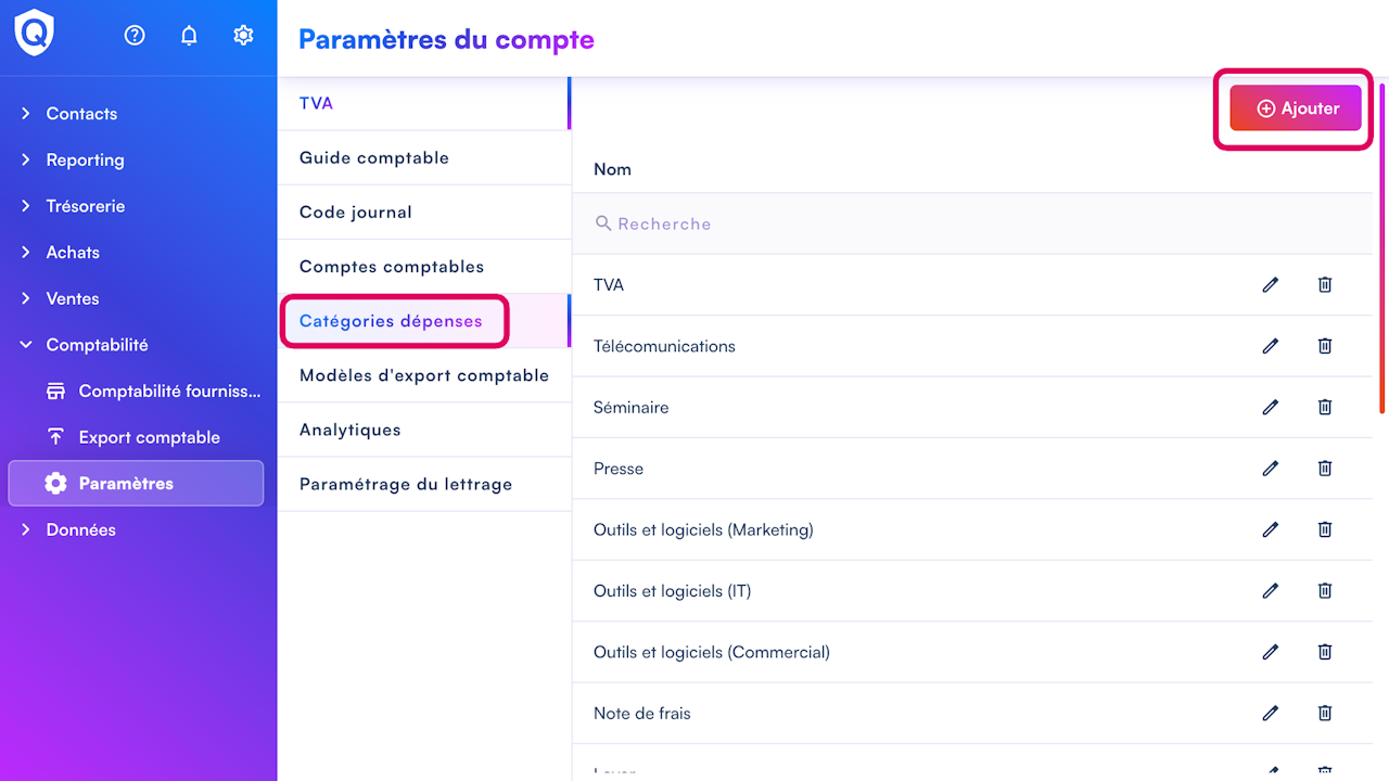 Une nouvelle fenêtre s'ouvrira, cliquez sur le bouton "Catégories dépenses", puis cliquez sur le bouton "Ajouter" à droite.