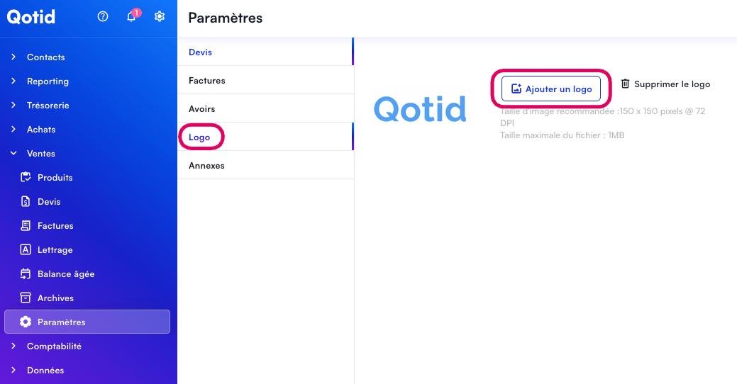 Pour ajouter le logo de votre société sur vos documents de ventes, vous pouvez vous rendre dans le module Ventes/Paramètres puis cliquer sur l'onglet Logo.