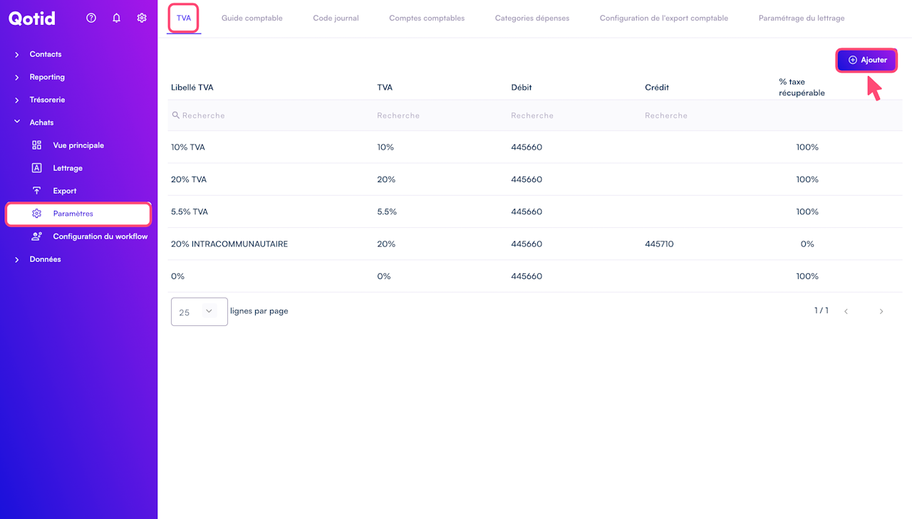 Une nouvelle fenêtre s'ouvrira, cliquez sur le bouton "TVA" en haut, puis cliquez sur le bouton "Ajouter" à droite.