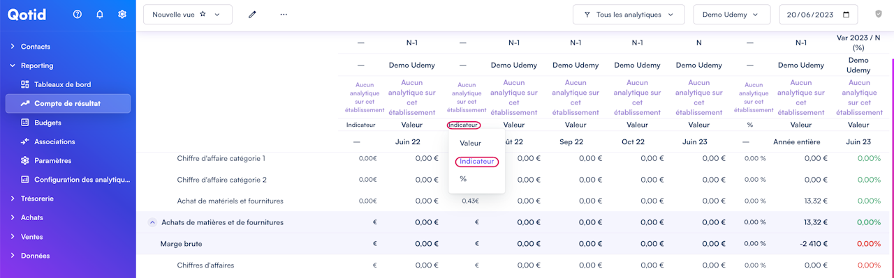 Pour afficher dans une ou plusieurs colonnes vos données sous forme d'indicateurs clés de performance (KPIs), il suffit de modifier les colonnes de votre rapport en cliquant sur Format de donnée et en sélectionnant Indicateur.
