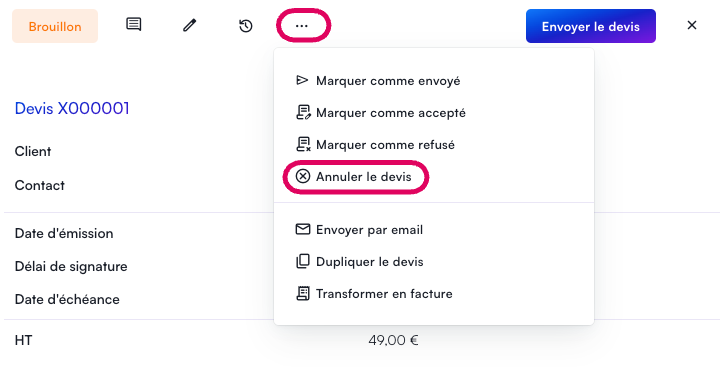 Cliquer sur les "..." puis sur Annuler le devis.