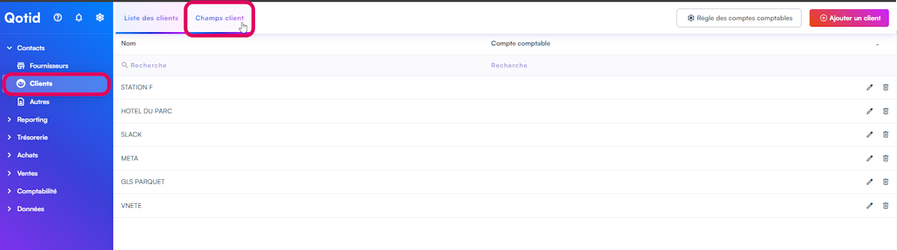 Pour configurer sa fiche client il faut dans un premier temps se rendre dans la liste de ses clients en cliquant sur "Contacts" puis sur "Clients". Une fois sur la page recensant tous les clients que vous avez ajouter, cliquez sur les "Champs client".