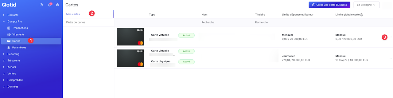 Depuis Qotid, cliquez sur Compte Pro, puis Cartes, puis ...