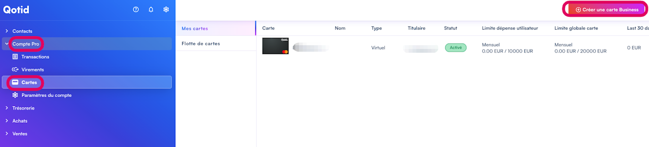 Pour créer votre carte de paiement Qotid, vous pouvez cliquer sur le module Compte Pro, puis cliquer sur la section Cartes.