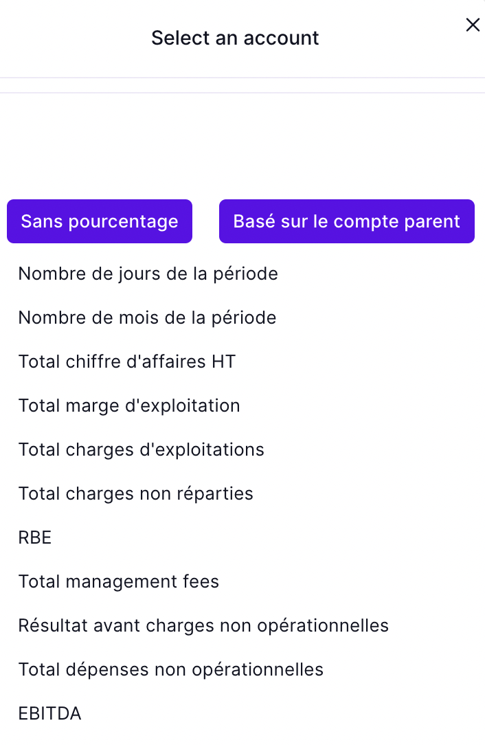Basé sur une rubrique : Dans ce cas, il suffit de sélectionner dans la liste la rubrique sur laquelle vous souhaitez baser le calcul du % Revenue et de cliquer sur "Sélectionner ce compte".