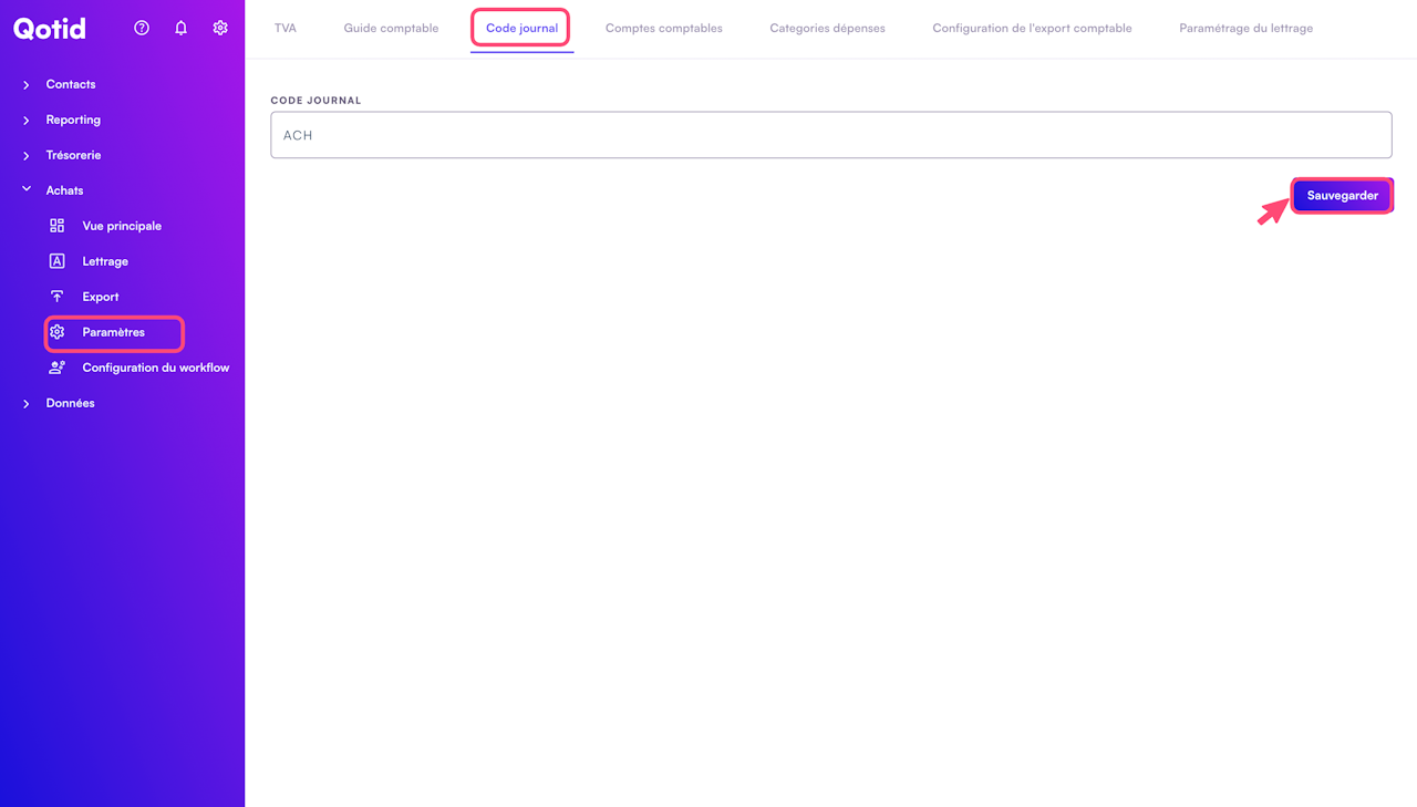 Une nouvelle fenêtre s'ouvrira, cliquez sur le bouton "Code journal" en haut, choisissez le code journal souhaité dans le libellé puis cliquez sur le bouton "Sauvegarder" à droite pour valider votre choix.