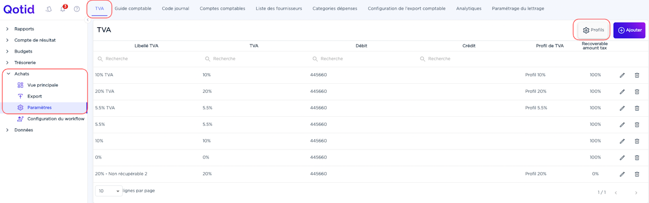 Une nouvelle fenêtre s'ouvrira, cliquez sur le bouton "TVA" en haut, puis cliquez sur le bouton "Profils" à droite.