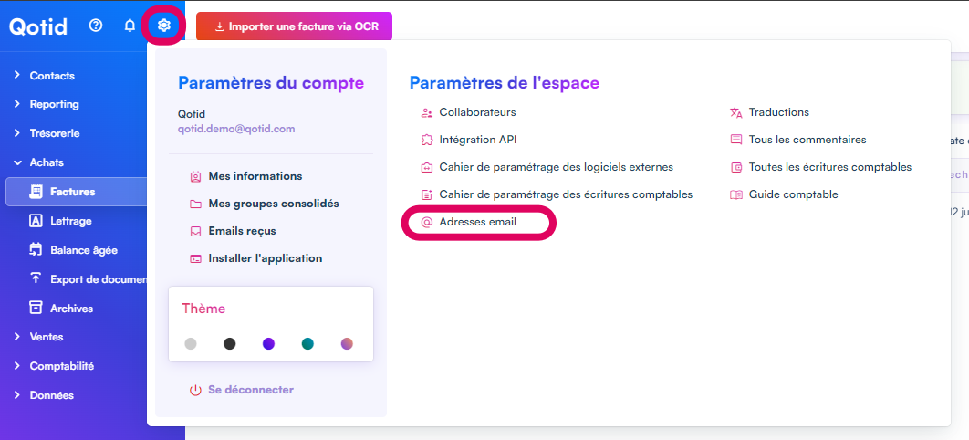 Cliquez sur le bouton "Paramètres du compte" dans le menu principal en bas de la page à gauche, puis cliquez sur "Adresses email".