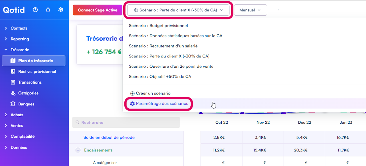 Pour dupliquer un budget de trésorerie, rendez-vous sur "Trésorerie", puis "Plan de Trésorerie", cliquer sur votre budget puis "Paramètres des scénario".