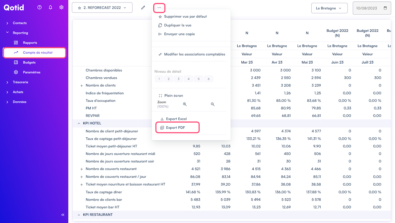 Rendez vous sur l'onglet "Compte de résultat", choisissez la date en haut à droite et la vue que vous souhaitez exporter.