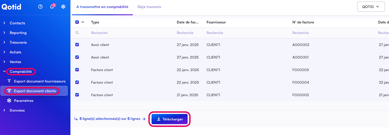 Une fois vos factures de ventes générées sur Qotid, vous pouvez vous rendre dans l'onglet Comptabilité / Export document clients.
