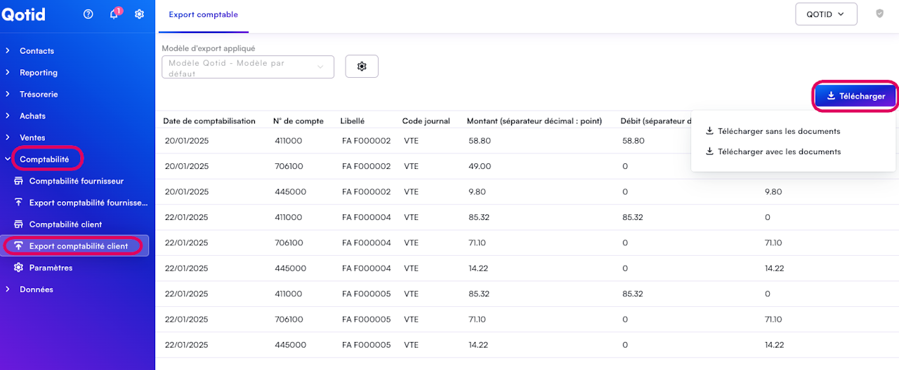 Une fois vos factures traitées sur Qotid, vous pouvez vous rendre dans l'onglet Comptabilité / Export comptabilité Client.
