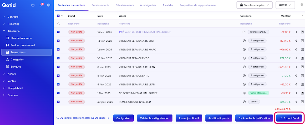Sélectionnez ensuite les transactions que vous souhaitez exporter et cliquez sur le bouton Export Excel.