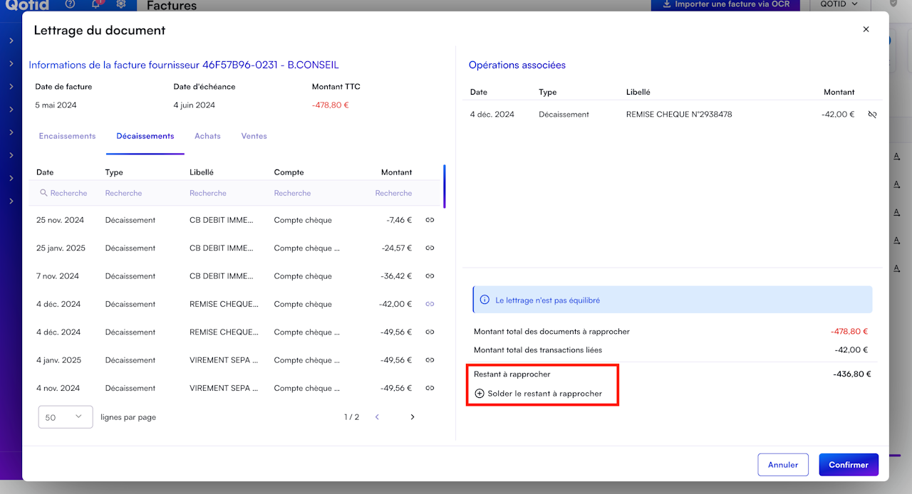 Si vous souhaitez clôturer une facture (la passer en statut "justifié" et non plus "lettrée partiellement") malgré un solde résiduel, cliquez sur Solder le restant à rapprocher.