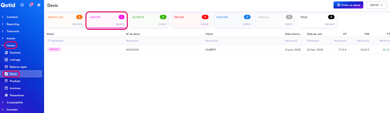 Pour consulter votre devis, vous pouvez vous rendre dans l'onglet Ventes / Devis puis sélectionner la rubrique Envoyé.