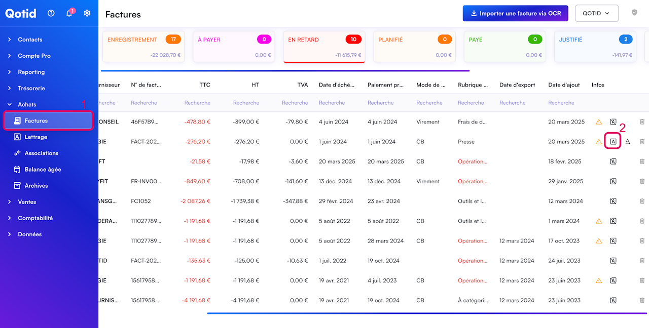 Ensuite, cliquez sur "Factures" puis sur le bouton sous forme de A à droite.