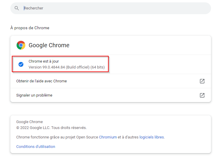 Pour ce faire, cliquez sur les 3 petits points sur la fenêtre de votre navigateur, puis sur "Aide" puis sur "A propos de Google Chrome".