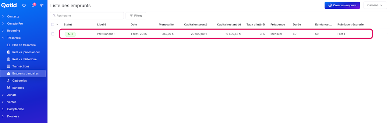 Pour cela, vous pouvez vous rendre sur l'onglet Trésorerie/Emprunts bancaires.