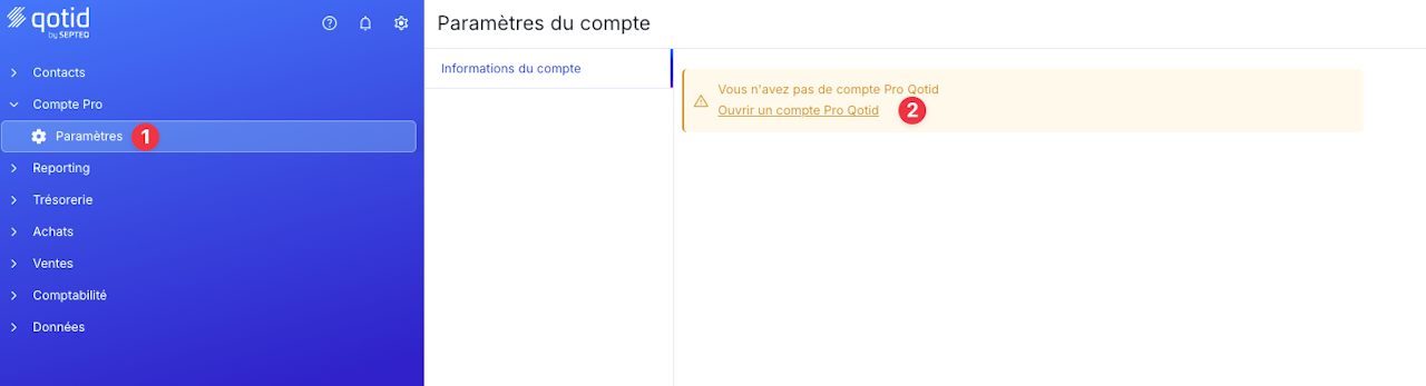 Pour démarrer l'ouverture du compte, cliquez sur Compte Pro, puis Paramètre puis Ouvrir un compte Pro Qotid.