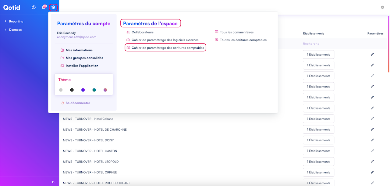 Pour accéder au cahier de paramétrage des écritures comptables de vos logiciels externes, il faut cliquer sur "Paramètres" (la roue crantée) puis sur "Cahier de paramétrage des écritures comptables".