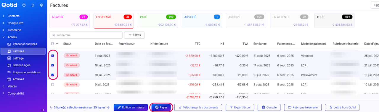Sélectionnez ensuite les factures que vous souhaitez payer via le compte pro et cliquez sur le bouton "Payer".