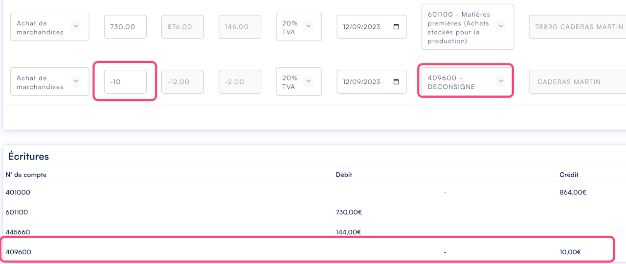 Pour prendre en compte les montants qui viennent réduire le prix d'achat final, il suffit d'indiquer un montant en négatif correspondant au montant de l'escompte ou de la consigne, déconsigne.