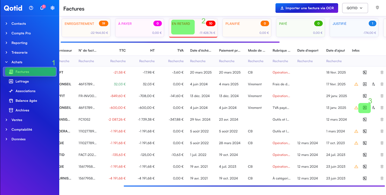 On commence par rechercher un des documents que l'on souhaite lettrer, puis on clique sur l'icône A sur la ligne du document pour faire apparaitre la fenêtre de lettrage.