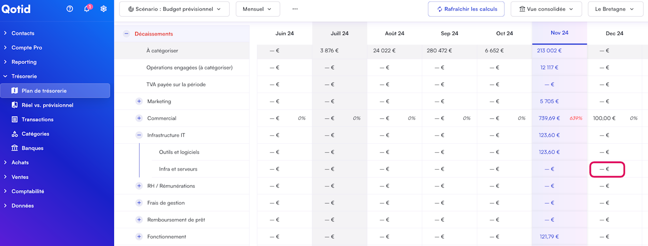 Cliquez sur la donnée budgétaire que vous souhaitez ajouter. (Exemple en screen : Infra et serveurs sur le mois de décembre)