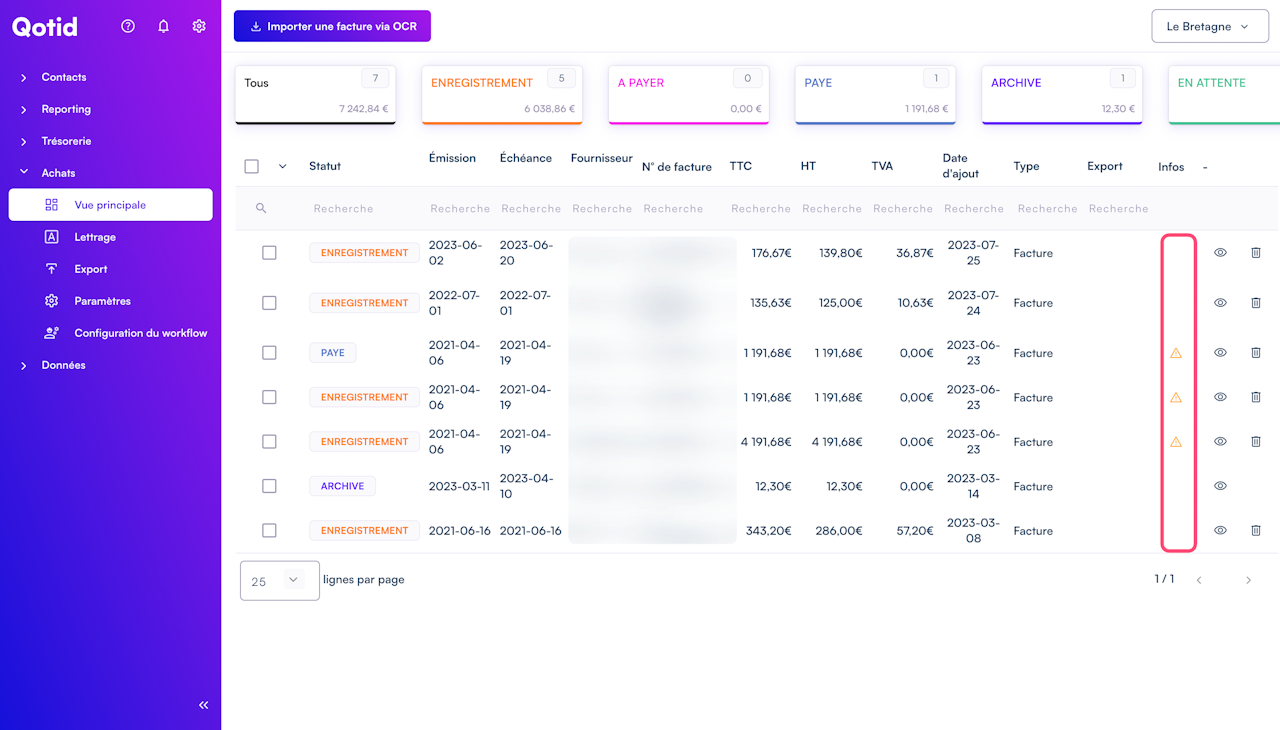 Si le "Triangle jaune" à droite s'affiche, cela signifie que vous avez importé la même facture 2 fois ou plus. Il s'agit d'un doublon.