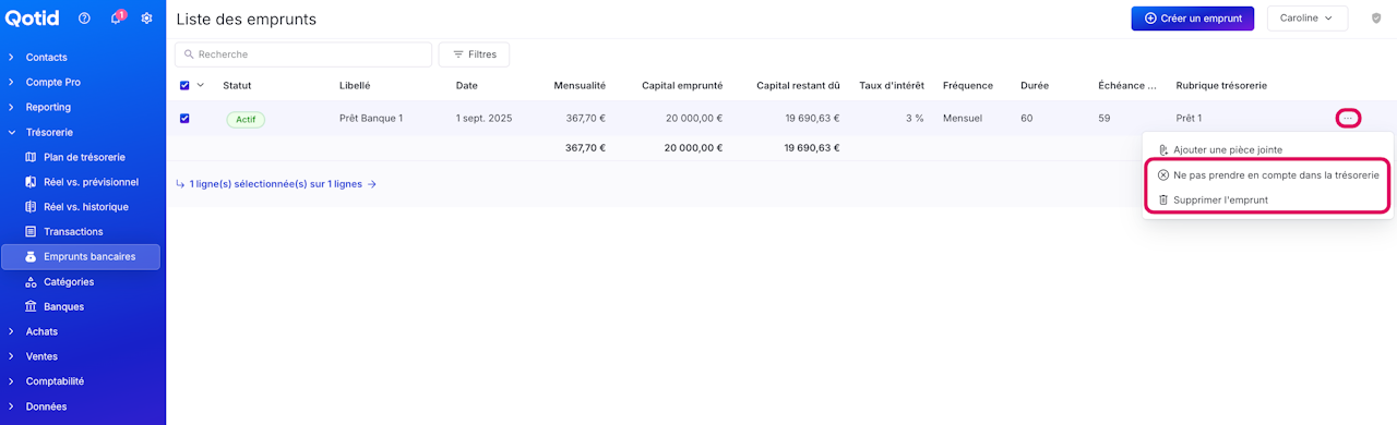 Sélectionnez l'emprunt concerné et cliquez sur les "..." à droite de la ligne.