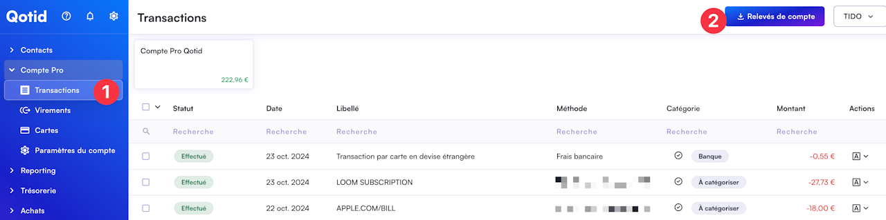Pour télécharger votre relevé de votre compte Pro Qotid il faut se rendre sous Compte Pro puis Transactions et cliquez sur Relevés de compte