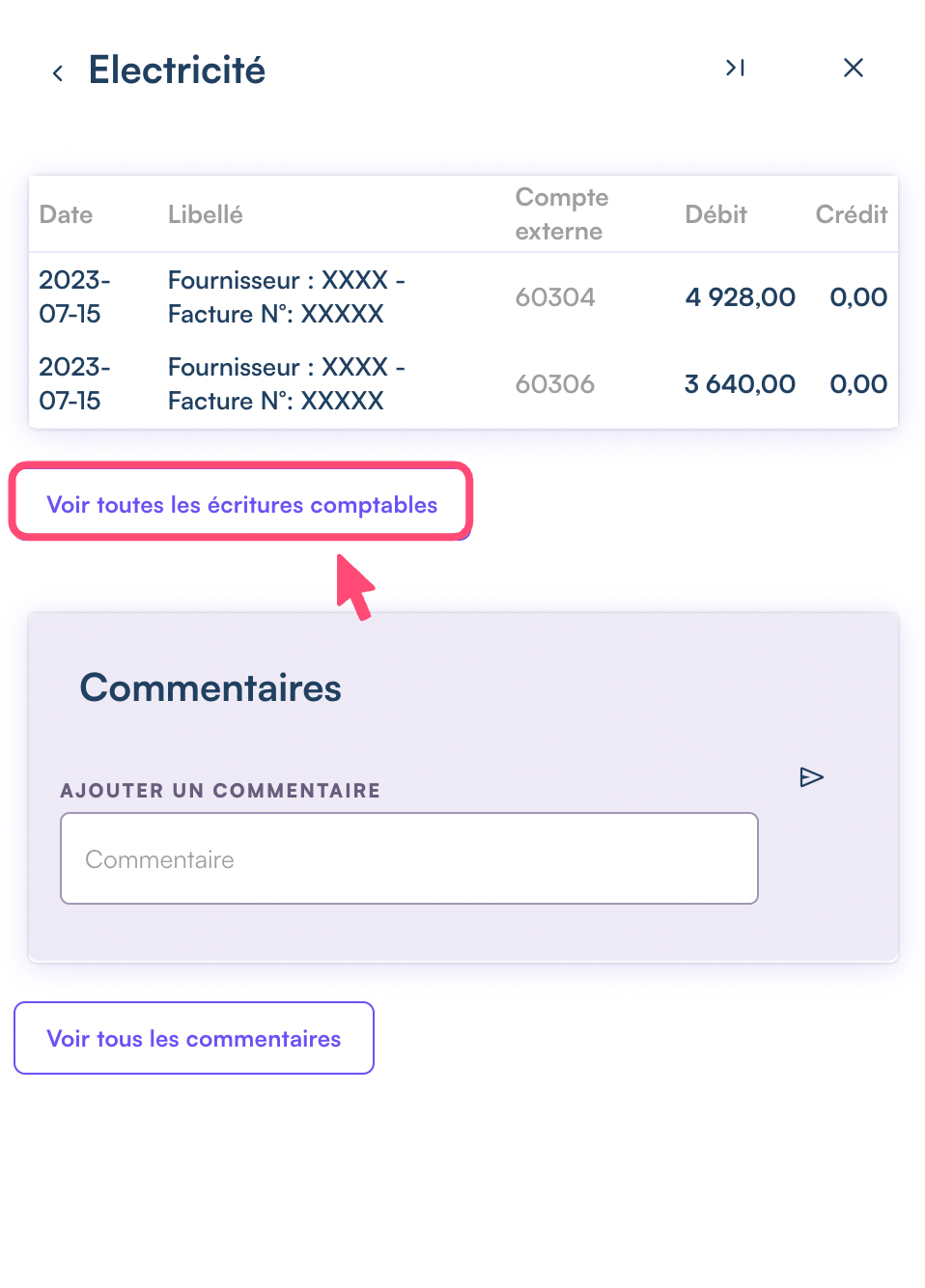 Cependant, il viendra éventuellement un moment où vous aurez besoin d'analyser de manière plus approfondie les écritures comptables issues de votre grand livre comptable. Pour cela, lorsque vous affichez le détail de vos écritures sur une rubrique de votre reporting, il suffit de cliquer sur "Voir toutes les écritures comptables".