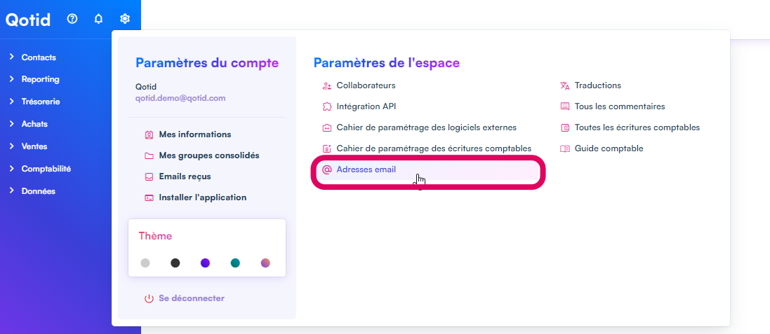 Pour se faire, rendez-vous dans les "Paramètres" en cliquant sur le rouage en haut à gauche, puis cliquez sur "Adresses emails".