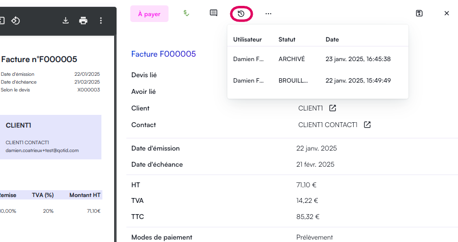 Cliquez ensuite sur l'icône horloge en haut de la facture pour consulter toutes les actions par collaborateur et par date.