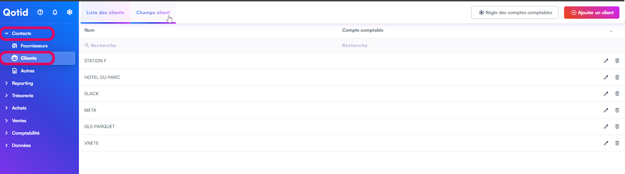 Il vous est possible de créer une fiche client sur Qotid. Pour se faire, cliquez sur "Contacts", puis cliquez sur "Clients" ce qui ouvrira la liste des clients.