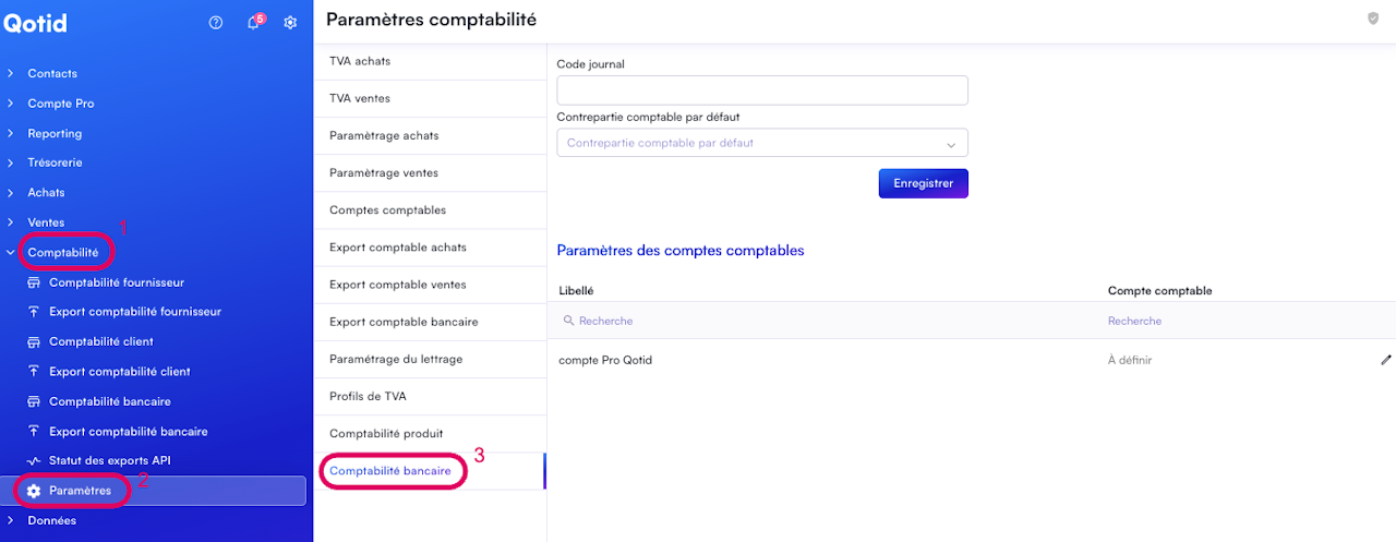 Plusieurs paramètres sont à renseigner avant de pouvoir exporter les écritures comptables liées aux transactions bancaires.